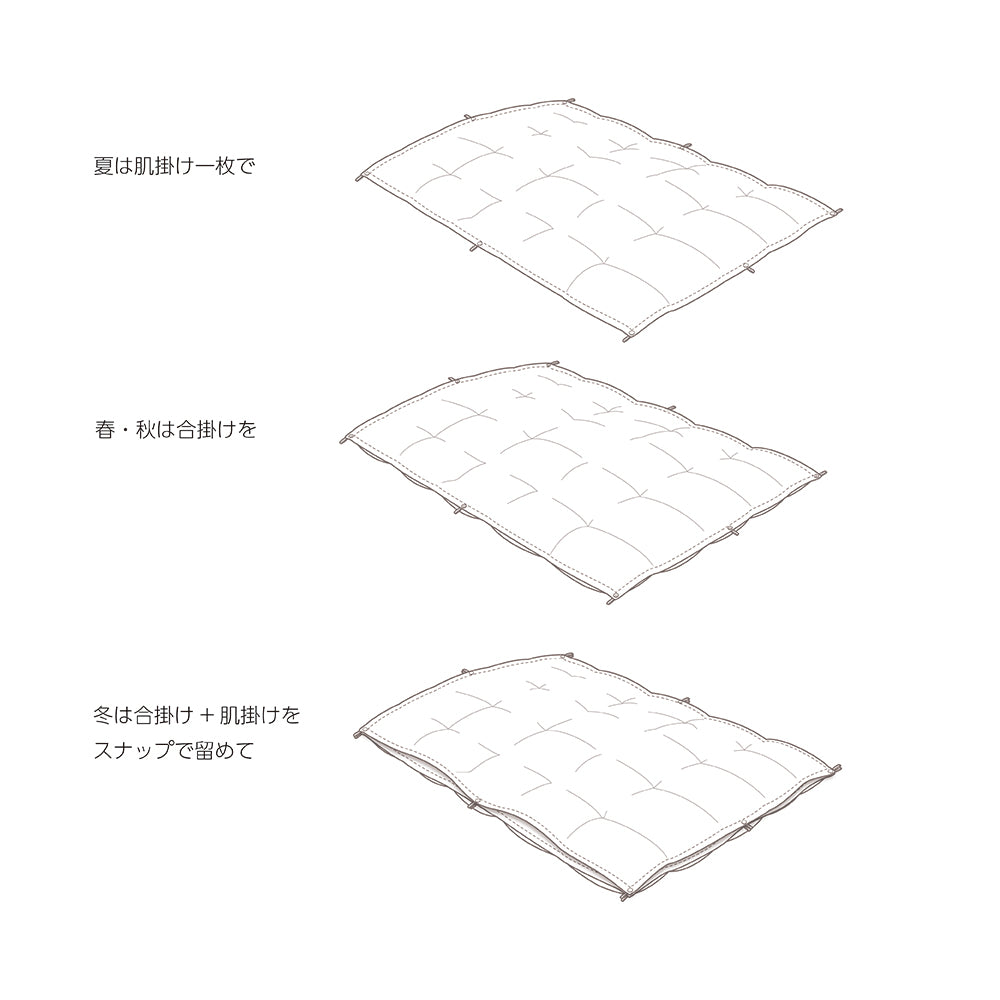 合掛けは春や秋に、肌掛けは夏に、そして2枚合わせて冬には暖かくご使用いただけます。